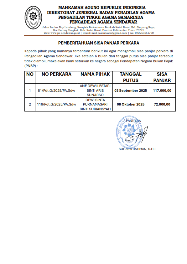 | 17 | 83/Pdt.G/2025/PA.Sdw | SURIADI ALIAS SURIYADI BIN JUSMAN | Rabu, 15 Okt. 2025 | RT. 002, Kampung Gadur, Kecamatan Mook Manaar Bulatn, Kabupaten Kutai Barat, Provinsi Kalimantan Timur |