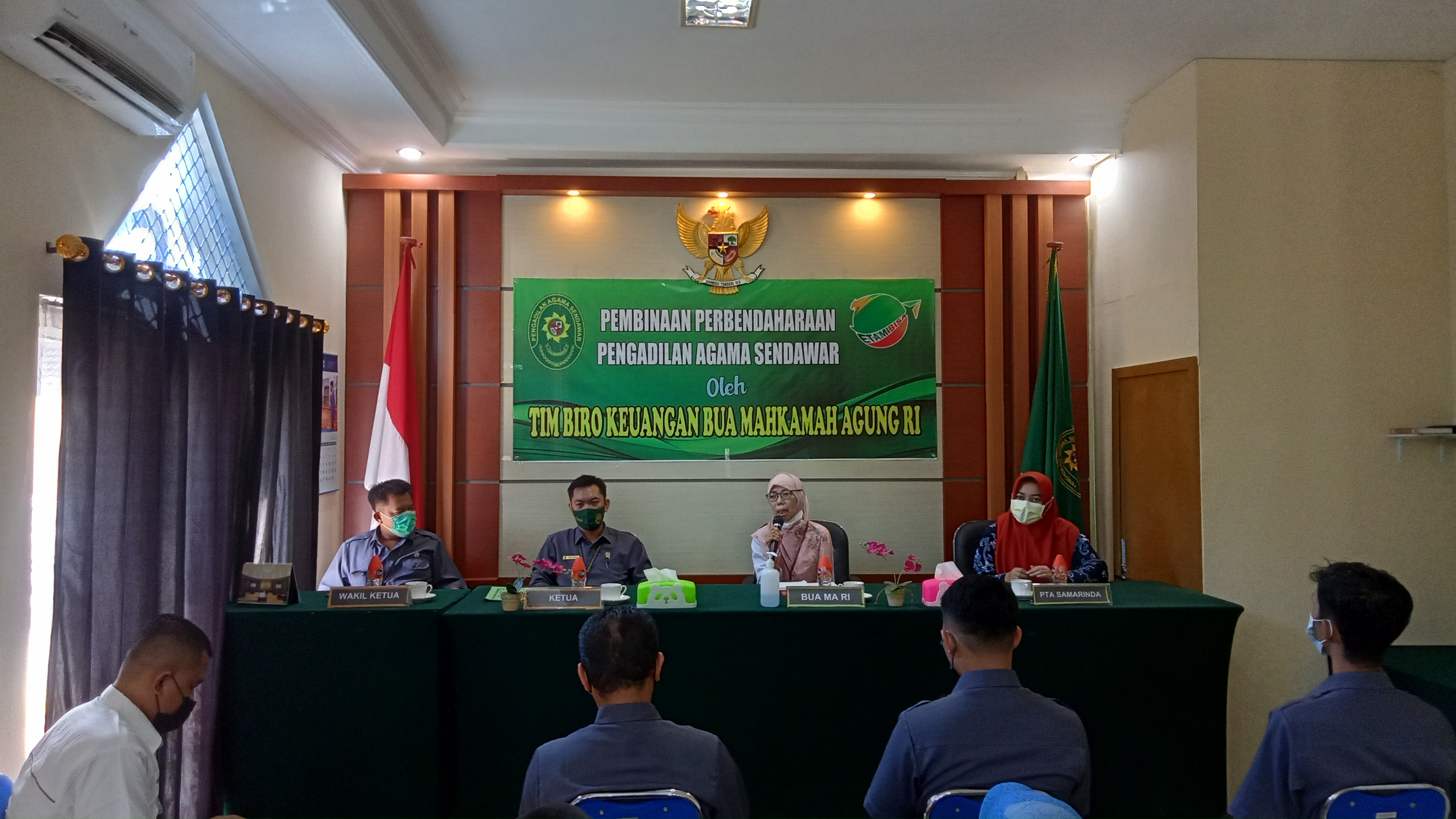 Sendawar - Pada hari Kamis, 3 Juni 2021, Tim Biro Keuangan Badan Urusan Administrasi Mahkamah Agung RI dan perwakilan dari Pengadilan Tinggi Agama Samarinda tiba di Pengadilan Agama Sendawar untuk melakukan pembinaan perbendaharaan dalam rangka tertib administrasi pelaksanaan Anggaran Pendapatan dan Belanja Negara Tahun 2021 berdasarkan Surat Tugas Nomor ST-0288/Bua.3/V/2021, yang disambut langsung oleh Ketua Pengadilan Agama Sendawar, Samsul Bahri, S.H.I, beserta dengan seluruh jajaran pegawai di Pengadilan Agama Sendawar.
