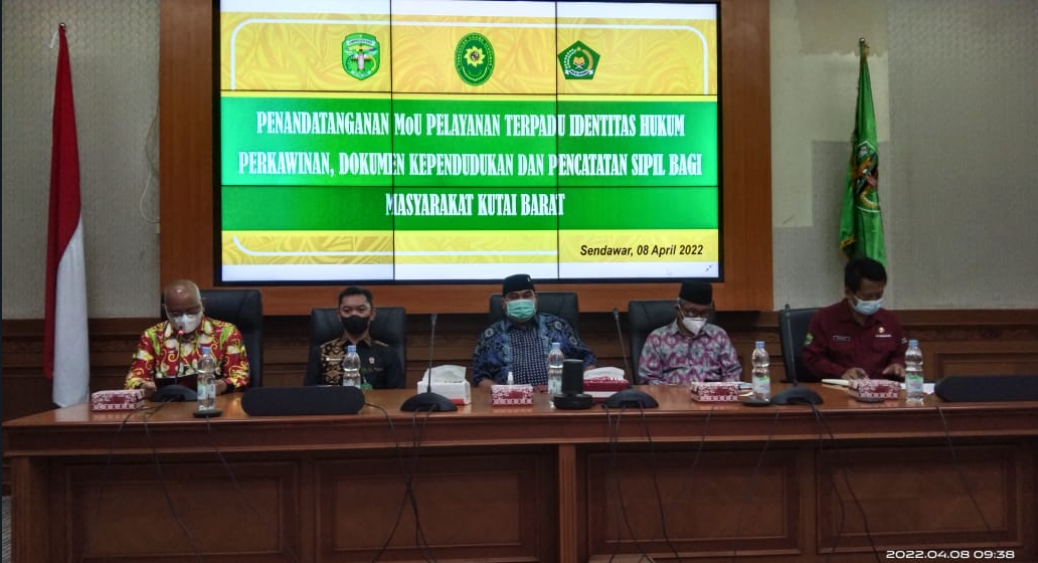 Sendawar, Jumat, 8 April 2022. Bertempat di lantai III ruang rapat Pemerintah Kabupaten Kutai Barat, dilaksanakan acara penandatanganan Memory of Understanding (MoU) atau nota kesepahaman antara Pemkab Kutai Barat melaui Dinas Kependudikan dan Pencatatan Sipil, Pengadilan Agama Sendawar, dan Kementrian Agama Kutai Barat.