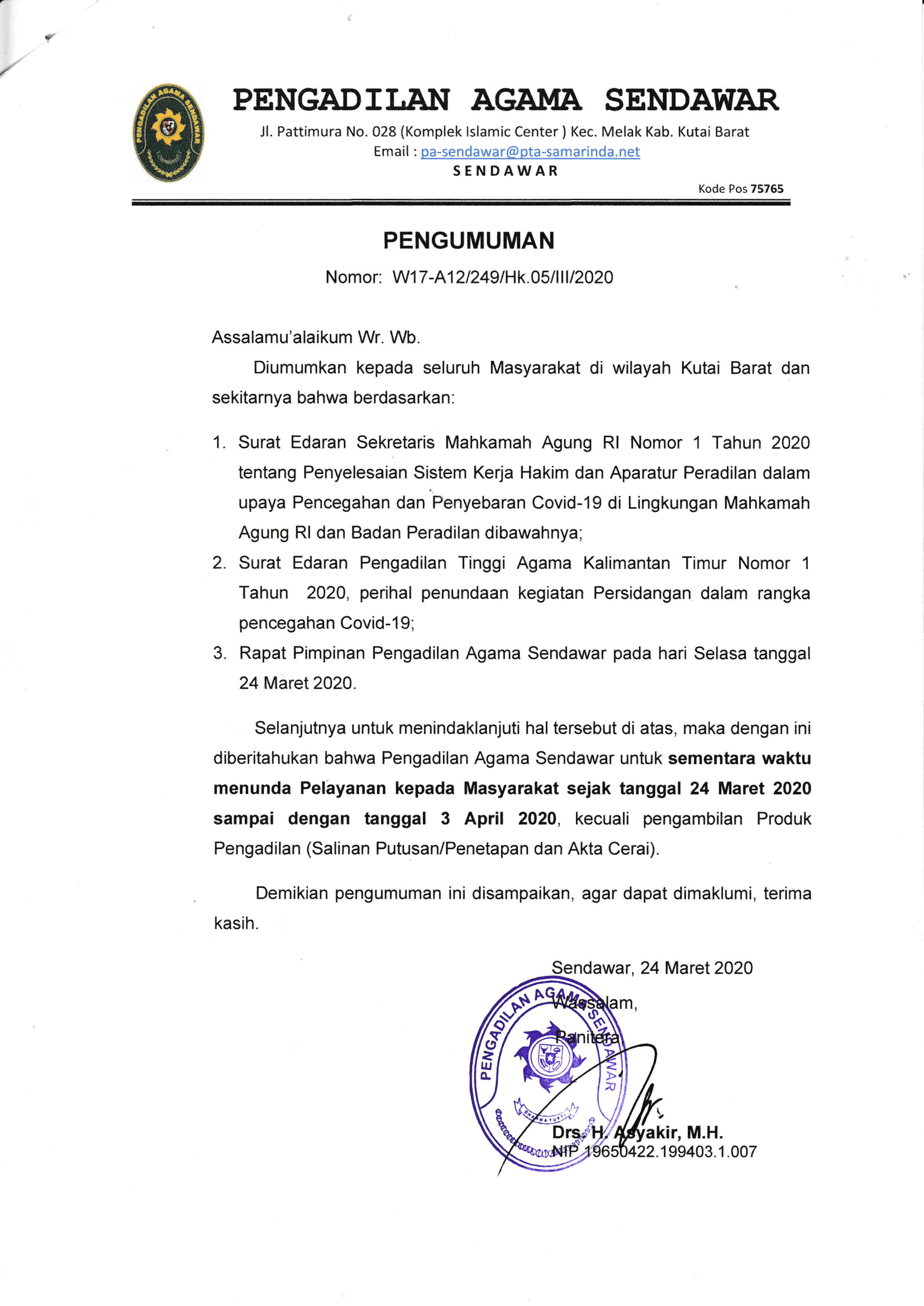 Selanjutnya untuk menindaklanjuti hal tersebut di atas, maka dengan ini diberitahukan bahwa Pengadilan Agama Sendawar untuk sementara waktu menunda Pelayanan kepada Masyarakat sejak tanggal 24 Maret 2020 sampai dengan tanggal 3 April 2020, kecuali pengambilan Produk Pengadilan (Salinan Putusan/Penetapan dan Akta Cerai).