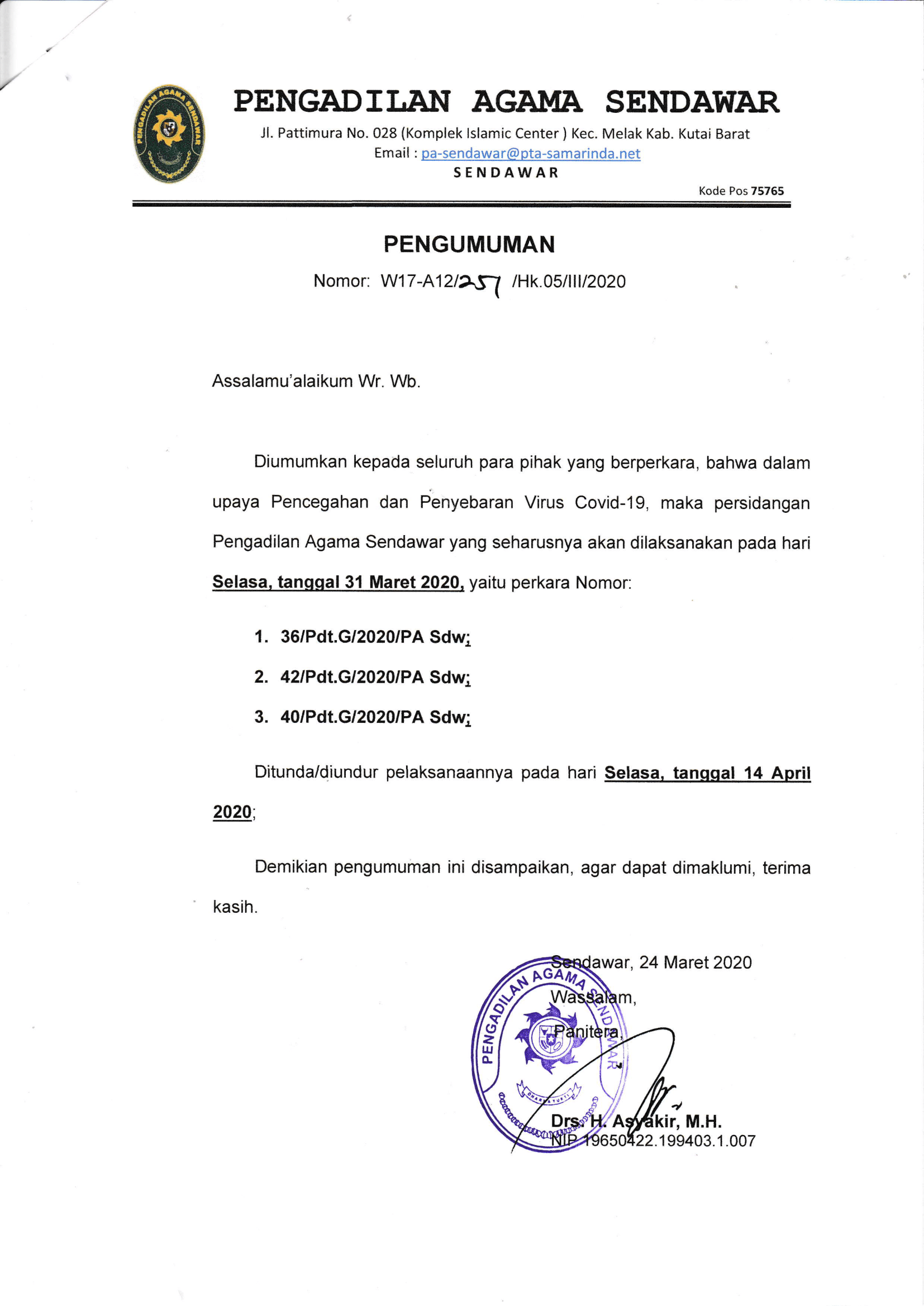 Diumumkan kepada seluruh para pihak yang berperkara, bahwa dalam upaya Pencegahan dan Penyebaran Virus Covid-19, maka persidangan Pengadilan Agama Sendawar yang seharusnya akan dilaksanakan pada hari