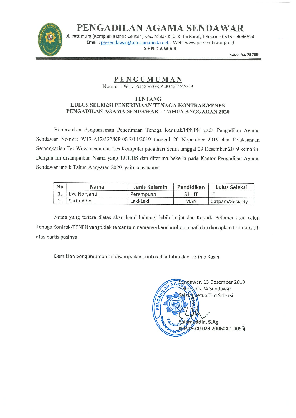 (Klik Disini) untuk mendownload Pengumuman PDF.